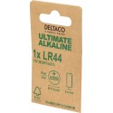 Singelpack med LR44 1.5V alkaliskt knappcellsbatteri utan bly, kadmium och kvicksilver. Lång livslängd till ett bra pris!