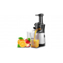 Effektiv slow juicer med stort och smidigt inmatningsrör och separata behållare för juice och fruktkött.