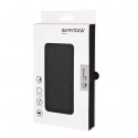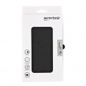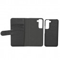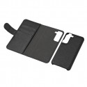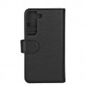Plånboksfodral i svart konstläder till Samsung Galaxy S22, 2-i-1 med löstagbart innerfodral och magnetisk stängning. Fodralet har tre kreditkortsfack och ett fack för sedlar.