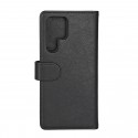 Plånboksfodral i svart konstläder till Samsung Galaxy S22 Ultra, 2-i-1 med löstagbart innerfodral och magnetisk stängning. Fodralet har tre kreditkortsfack och ett fack för sedlar.