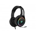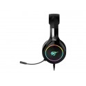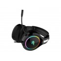 Gamingheadset med mjuka kåpor av minnesskum som sitter bra och isolerar ljud utifrån. Headsetet har snygg RGB-belysning på kåporna och ansluts med 3.5 millimeters ljudkontakt plus en USB-kabel för belysningen.