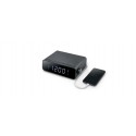 Klockradio med sedvanliga funktioner som tydlig tidvisning, larm med snooze och inbyggd FM-radio - men också modern funktionalitet som trådlös laddning av din mobiltelefon på ovansidan samt en USB-port på baksidan som du också kan ladda mobilen med. Klockradion drivs med den medföljande AC-adaptern.