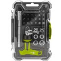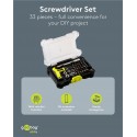 Eergonomiskat skruvmejsel- och bitsset som kombinerar en T-formad bitshållare med kvalitetsbits och smart förvaring för effektivt och bekvämt arbete. Det kompakta, stapelbara formatet på lådan gör setet perfekt för både hemmaanvändare och proffs som vill ha ordning och reda och få precision i varje skruvtag.